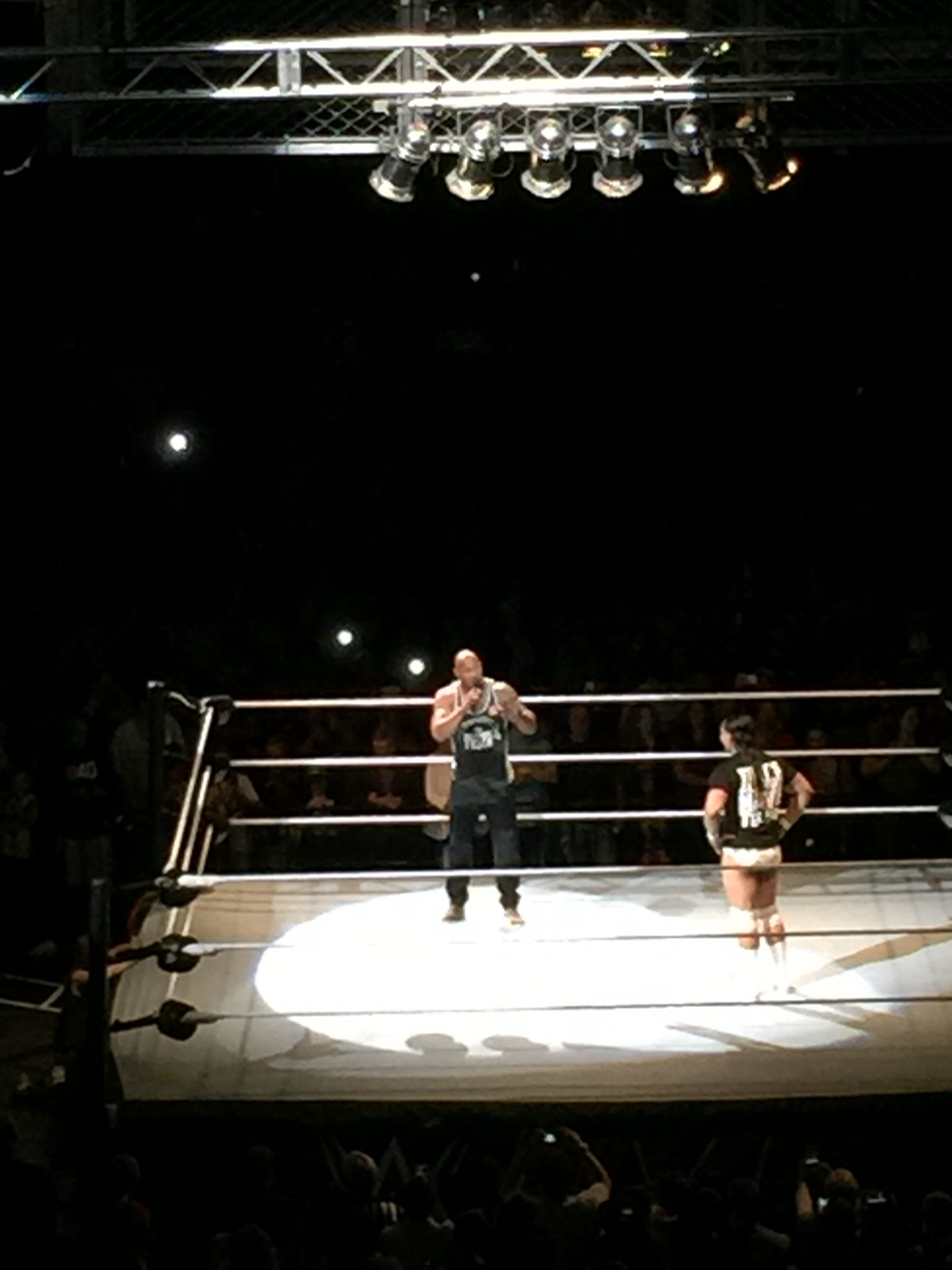 Mid-show, comedy wrestler Bo Dallas was in the ring, preaching his “Bo-Lieve” rhetoric, when suddenly the arena heard: “If ya smelllllll…” Out came Dwayne “The Rock” Johnson. After filming all day, he stopped by just to hear the crowd chant his name. He filmed the fans on his phone, hit Bo Dallas with the Rock Bottom and People’s Elbow, and left to a thunderous ovation.