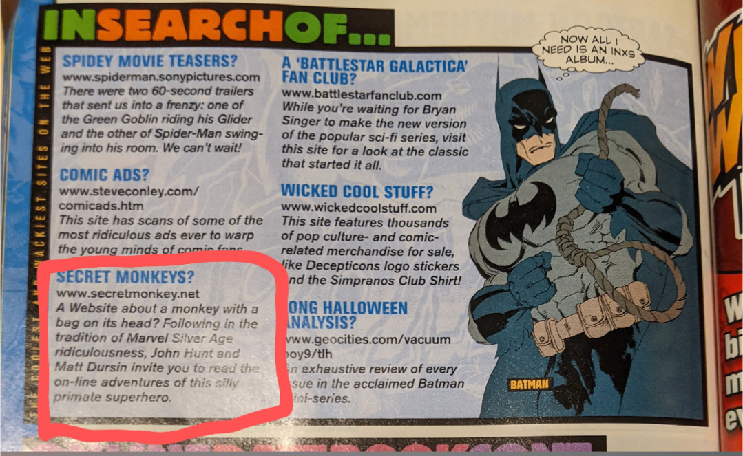 I work in the basement. Once in awhile, a man dressed in chainmail comes down to give me a slab of raw meat for supper and tells me who is winning the American League Eastern Division. It’s not an easy life, but what is? Anyway, last month, John Hunt came to me and said, “Mike, you’re one of my best writers, and I trust you implicitly.” “Thanks,” I replied, “But I’m Matt.” “Mark, I trust you, so that’s why I’m giving you a plum assignment as a writer on our brand new book. It will be the biggest book to hit the stands since The Death and very quick subsequent Rebirth of Superman. It’s called… (pause)…(more)… The Secret Monkey.”