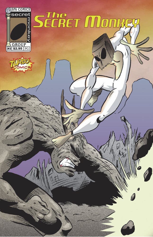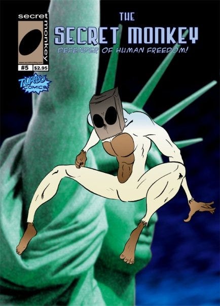 The comic was a satire of old-school Marvel books written by Stan Lee. He was an albino monkey from the future who could talk, and he used his monkey agility and strength to fight crime. He was basically Spider-Man in money-form, and he wore a paper bag over his head as a disguise (hence the “secret” part.)